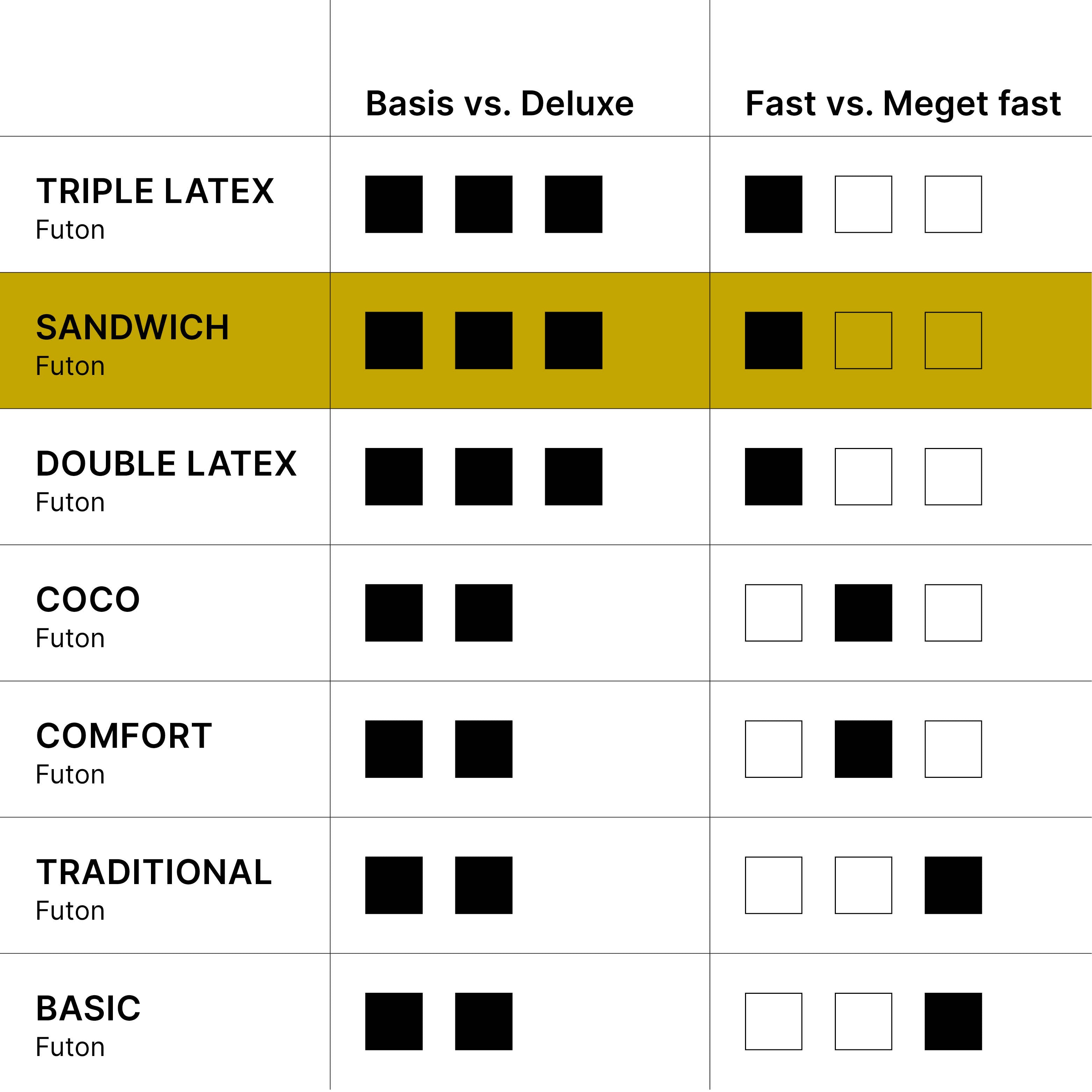 Our Sandwich futon is a 16 cm thick cotton bed mattress with a core of latex foam and a coco fibre plate. By applying 5-10% polyester to our cotton, we ensure the higher density and thickness of our futons compared to traditional Japanese futon bedding. However, it still inherits all the good qualities of a traditional Japanese futon. The Sandwich futon will give you a medium-soft sleeping comfort. The cotton in the futon will adjust itself to your body, the coco plate will support it, and the soft latex foam in the core will isolate slight movements.